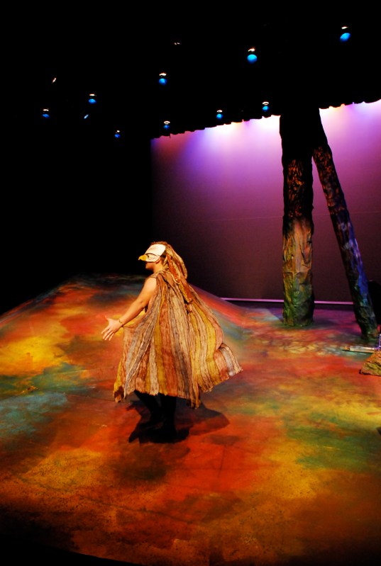 As the textile artist for Rosa and Blanca, I used a multiple-step dye process to create the Eagle’s “wings”. I “broomsticked” and dyed strips of lightweight silk in warm baths of RIT dye in red, yellow, or blue. After the color had set, I re- “broomsticked” the strips and dyed them in a brown bath to mute the color and create more depth within the textile design. From there the strips were serged together, and the scraps from the serger were added to the vest for additional texture.