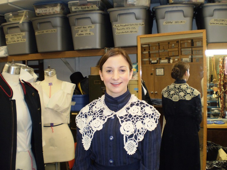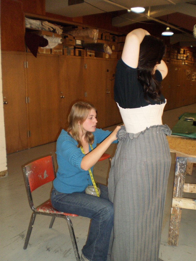 For the final costume for Masha, Franzesca and I pleated, basted, and starched 8 yards of grey wool, before fitting it to the actress’s waist and adding a waistband.