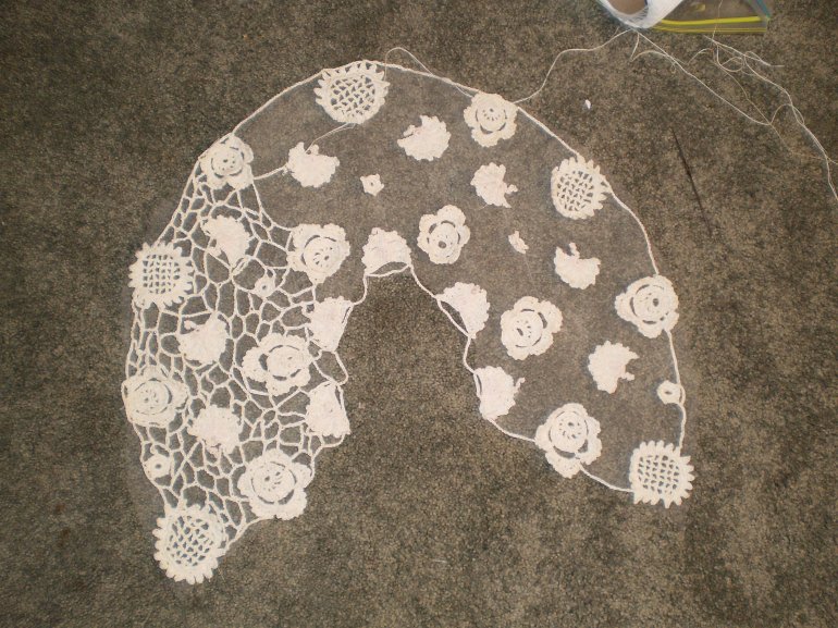 I also crocheted the mantle for the character of Olga. Evoking the style of Irish crochet, I crocheted flower shapes out of perle cotton, mounting the flowers on netting and then chaining them together.