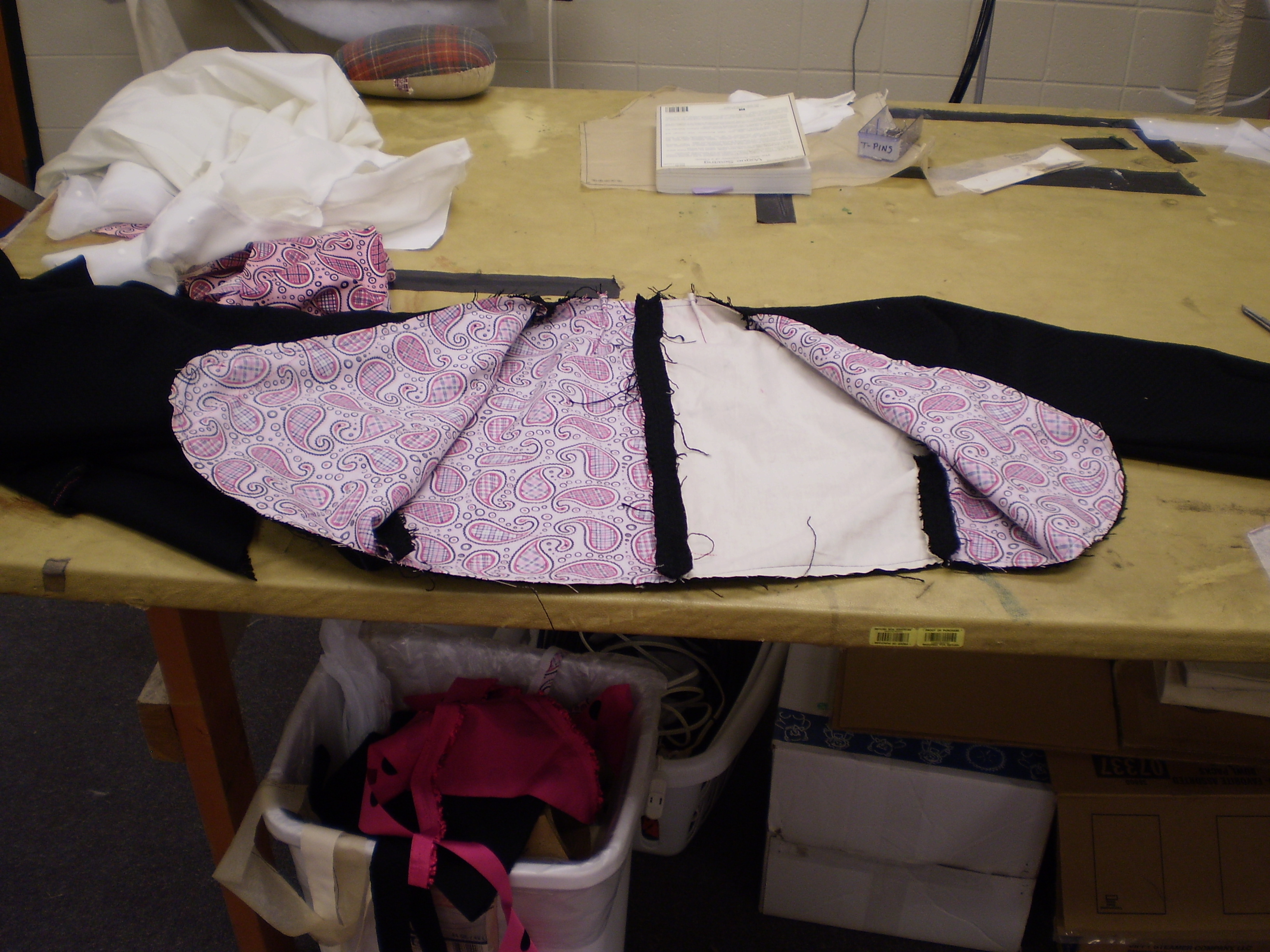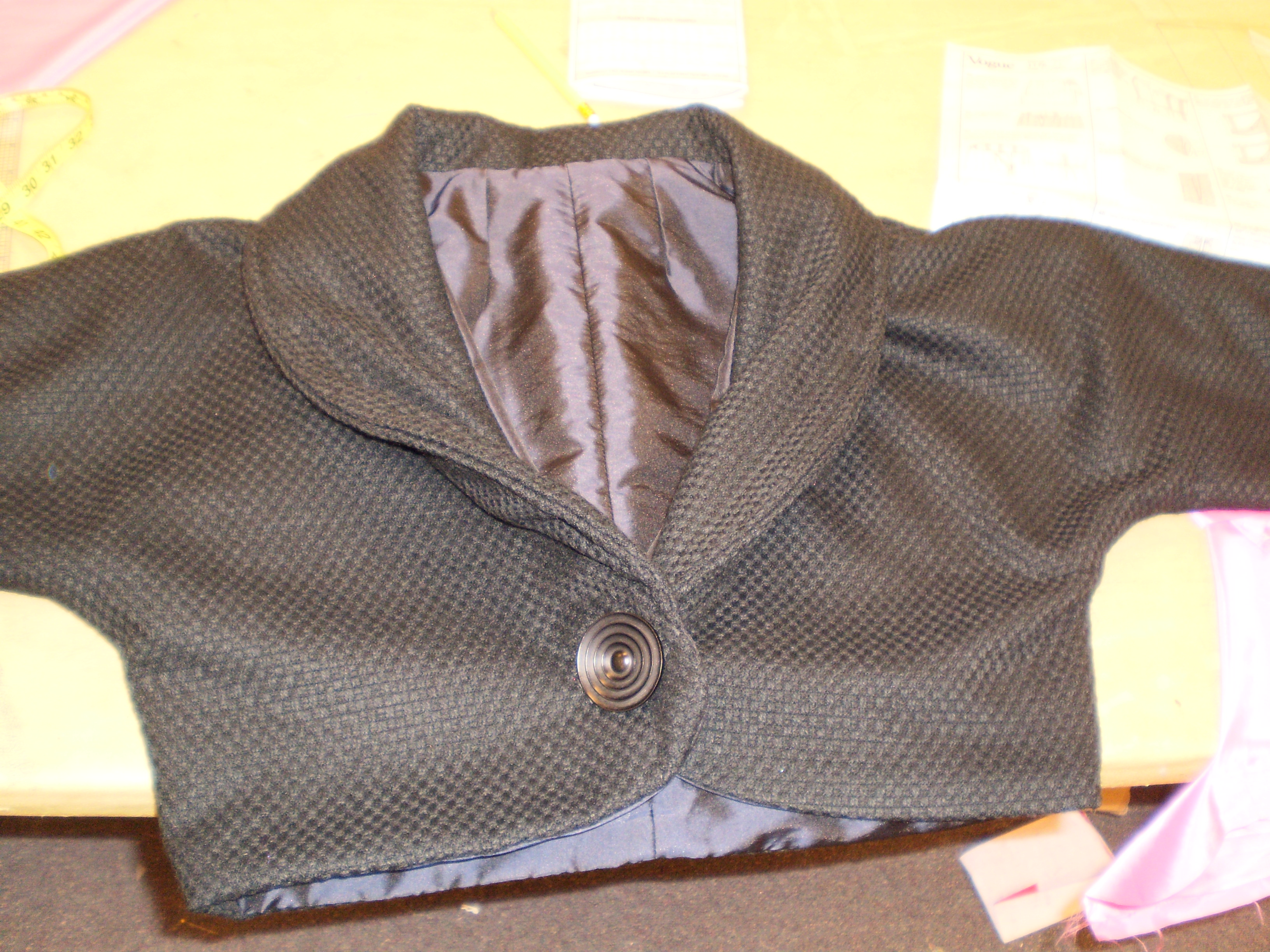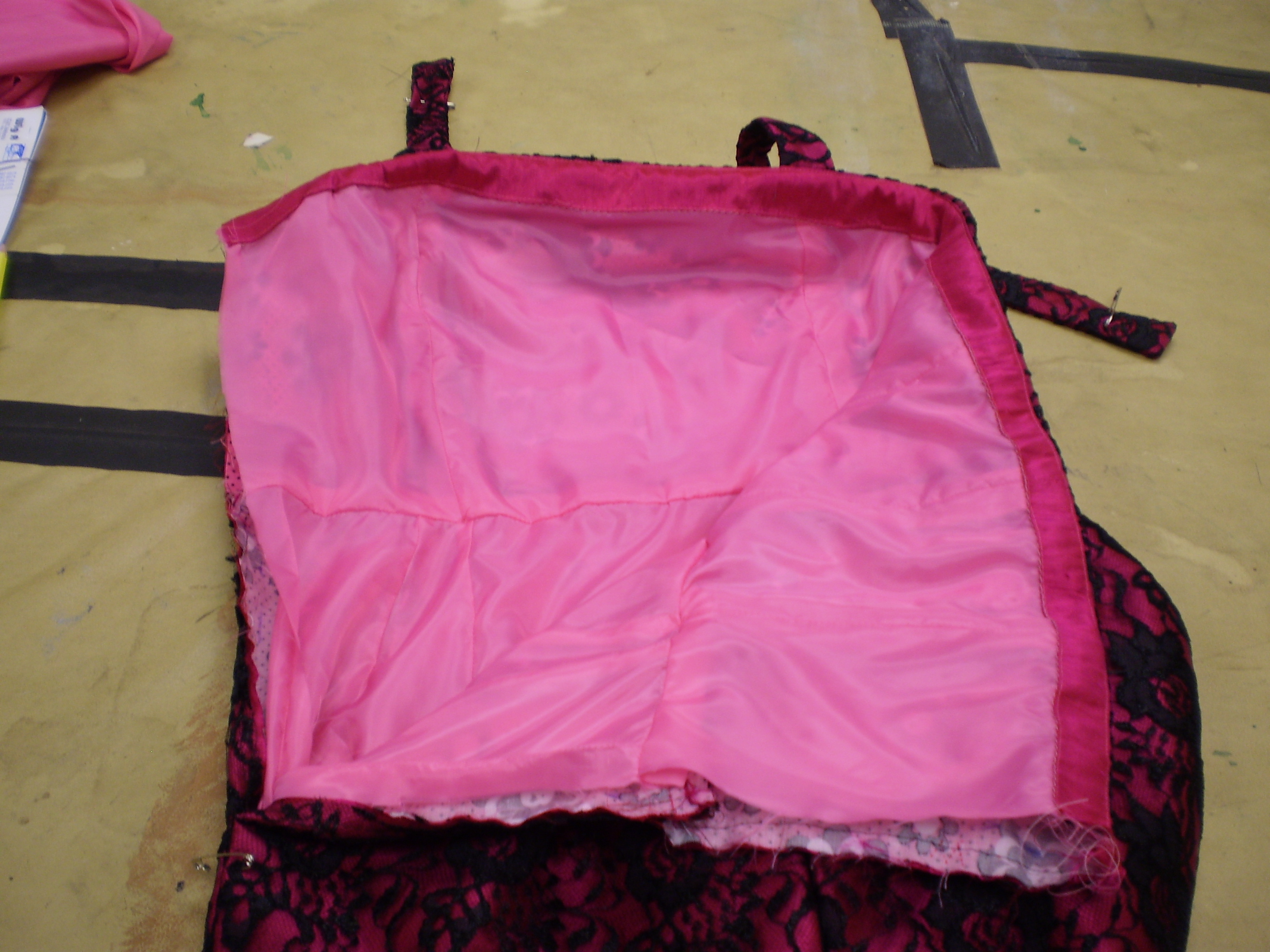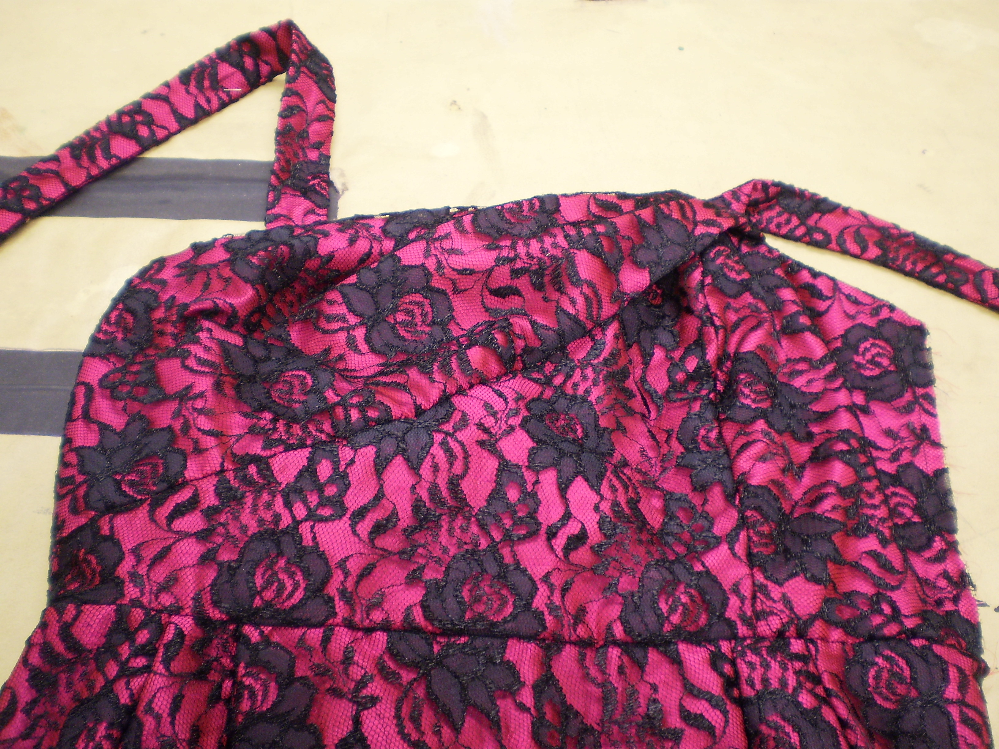 For Little Shop of Horrors, I constructed 2 dresses and a bolero jacket. One of the dresses and the jacket were for Audrey, made of pink dupioni silk, covered in lace with a side-lapped zipper, made from the pattern Vogue 1176. All pieces were fully lined.