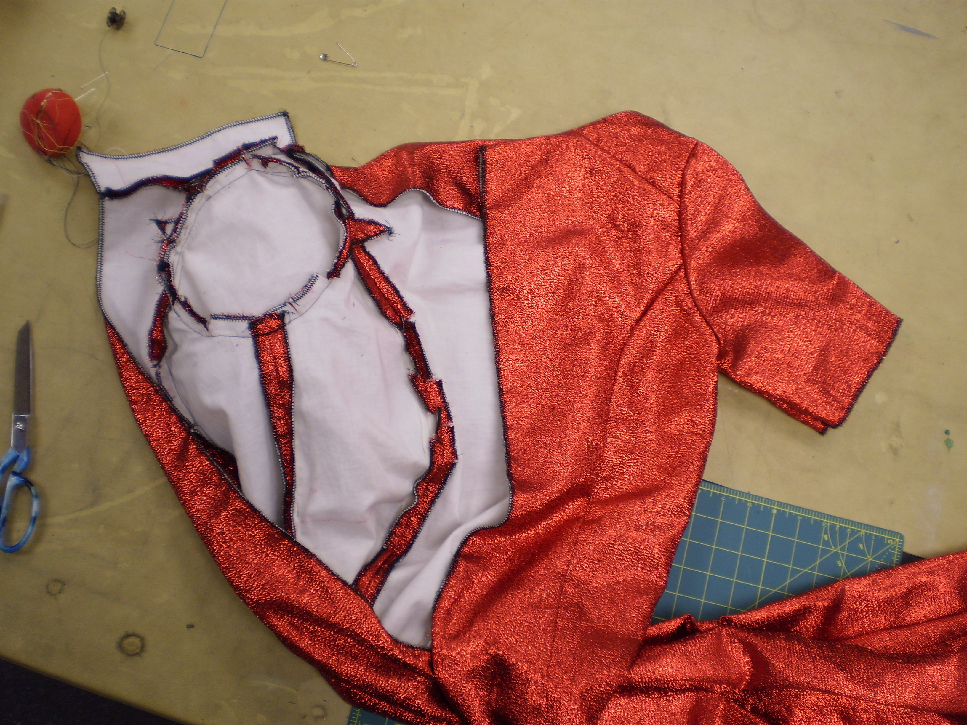 The other dress I built was for one of the chorus girls, designed with the Dreamgirls in mind. A fun challenge was the textile chosen for the chorus: a loosely-woven lamé that had to be serged to the flatlining for stability.