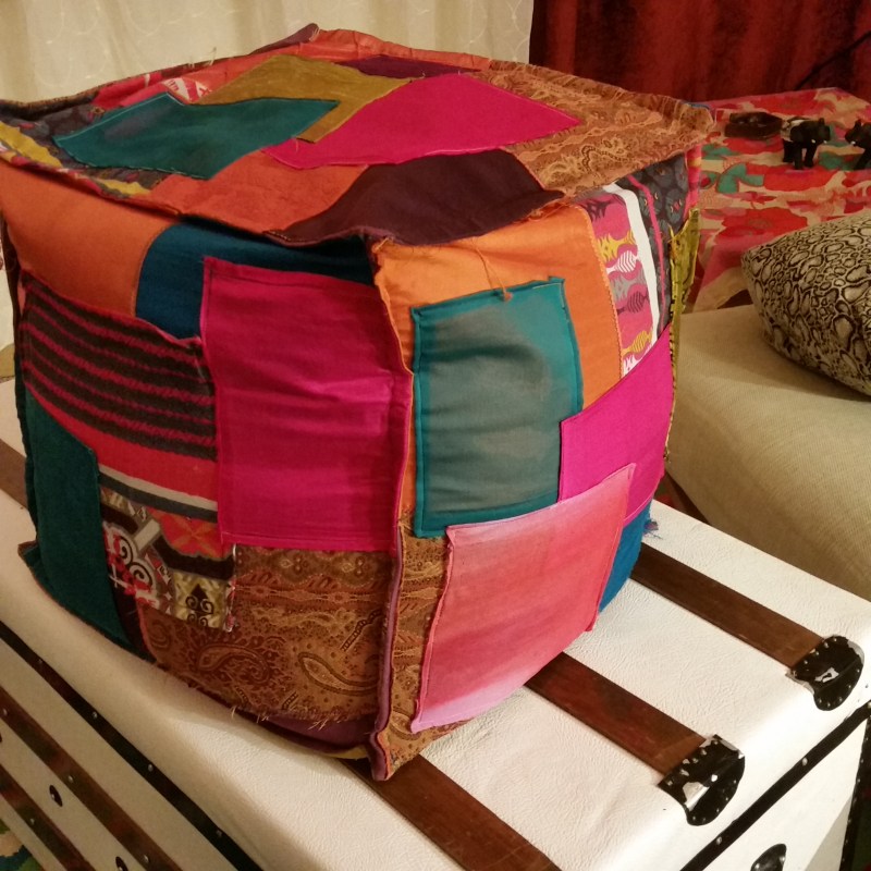 I’m a big sucker for boho chic decor, so one of my stash-busting-home-decor dreams was to make a big ottoman, combining some of my favorite fabric scraps into a vibrant fabric collage for the cover.
