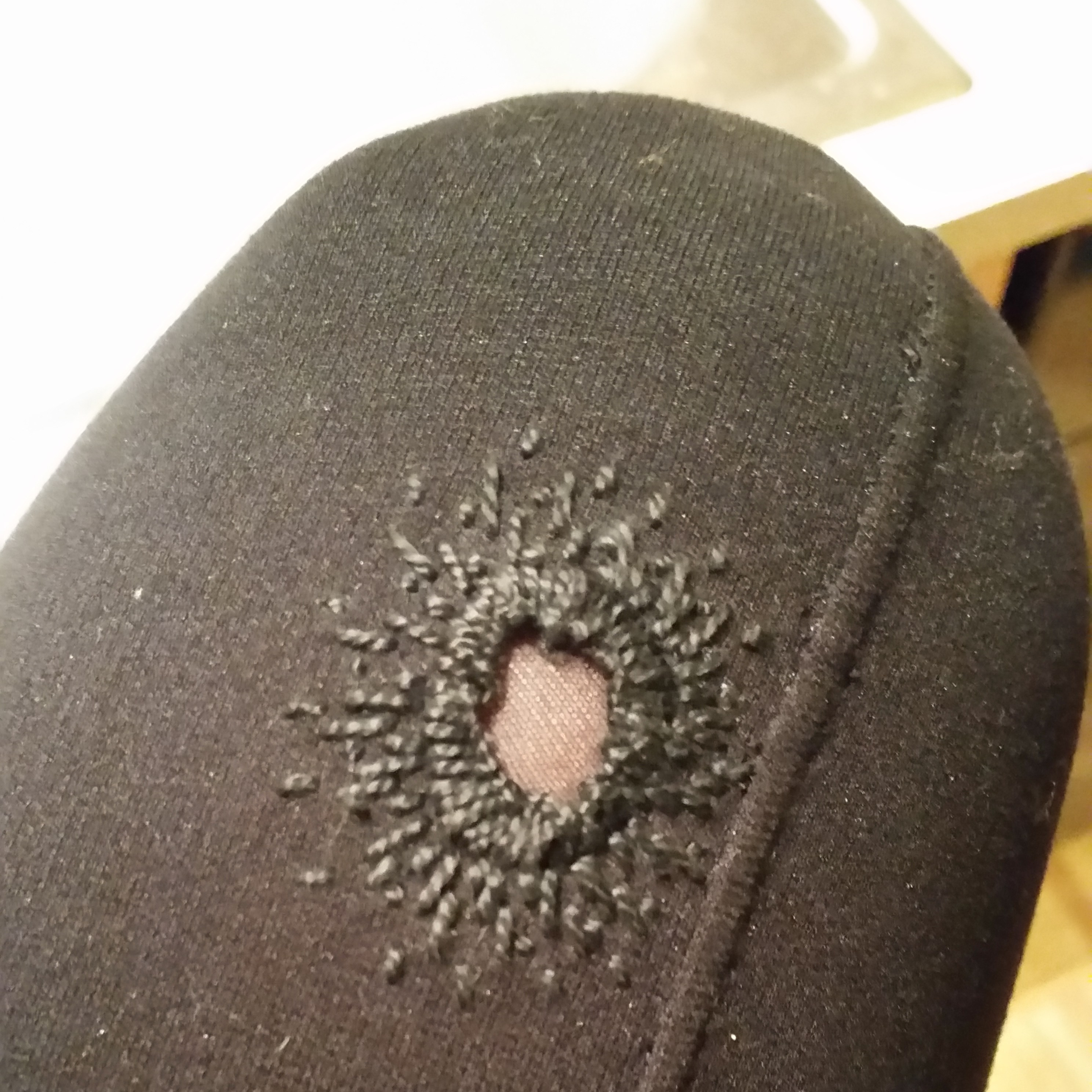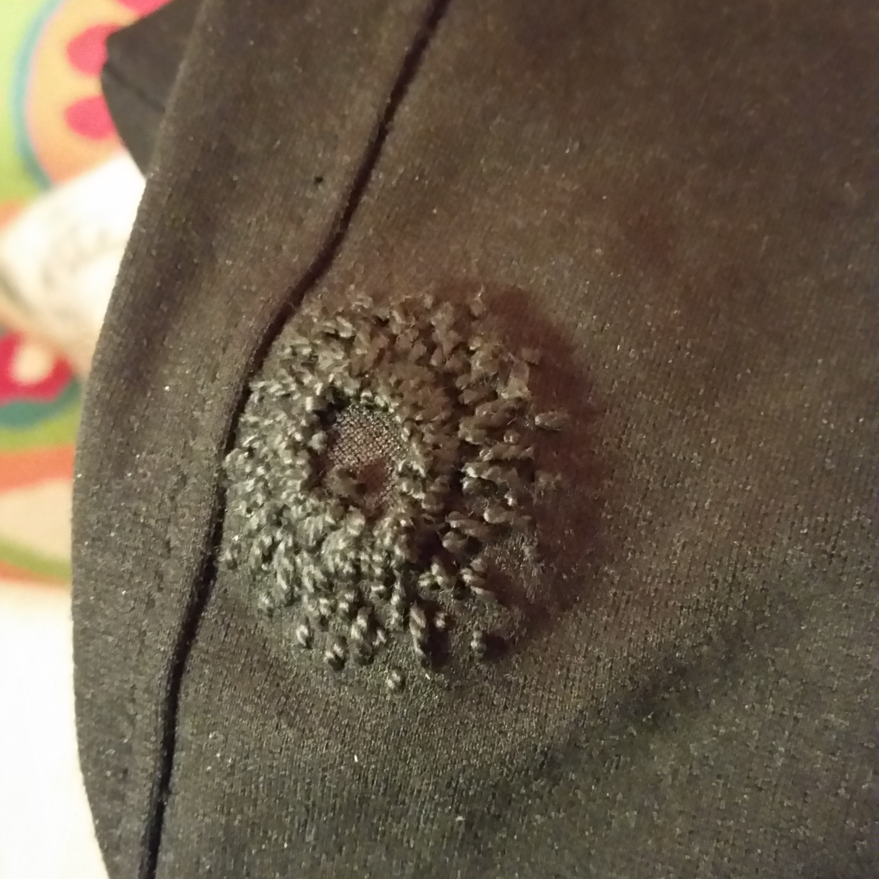 I layered a lighter knit behind the hole for support. Again I opted for a subtle texture, black floss on black knit, but in a radiating stitch that evokes the collision that caused the damage. Weirdly, I like the pants more now with the repair. ❤