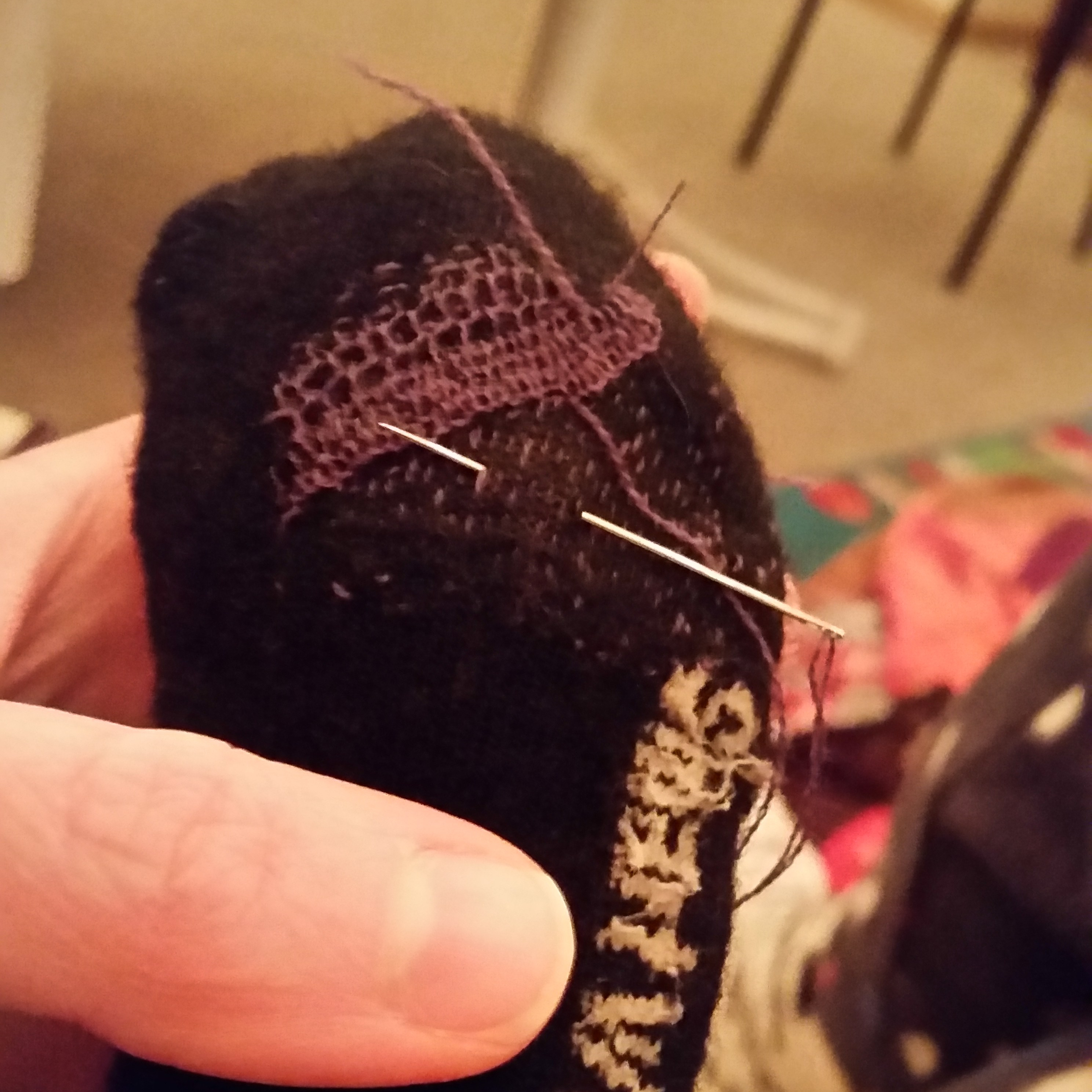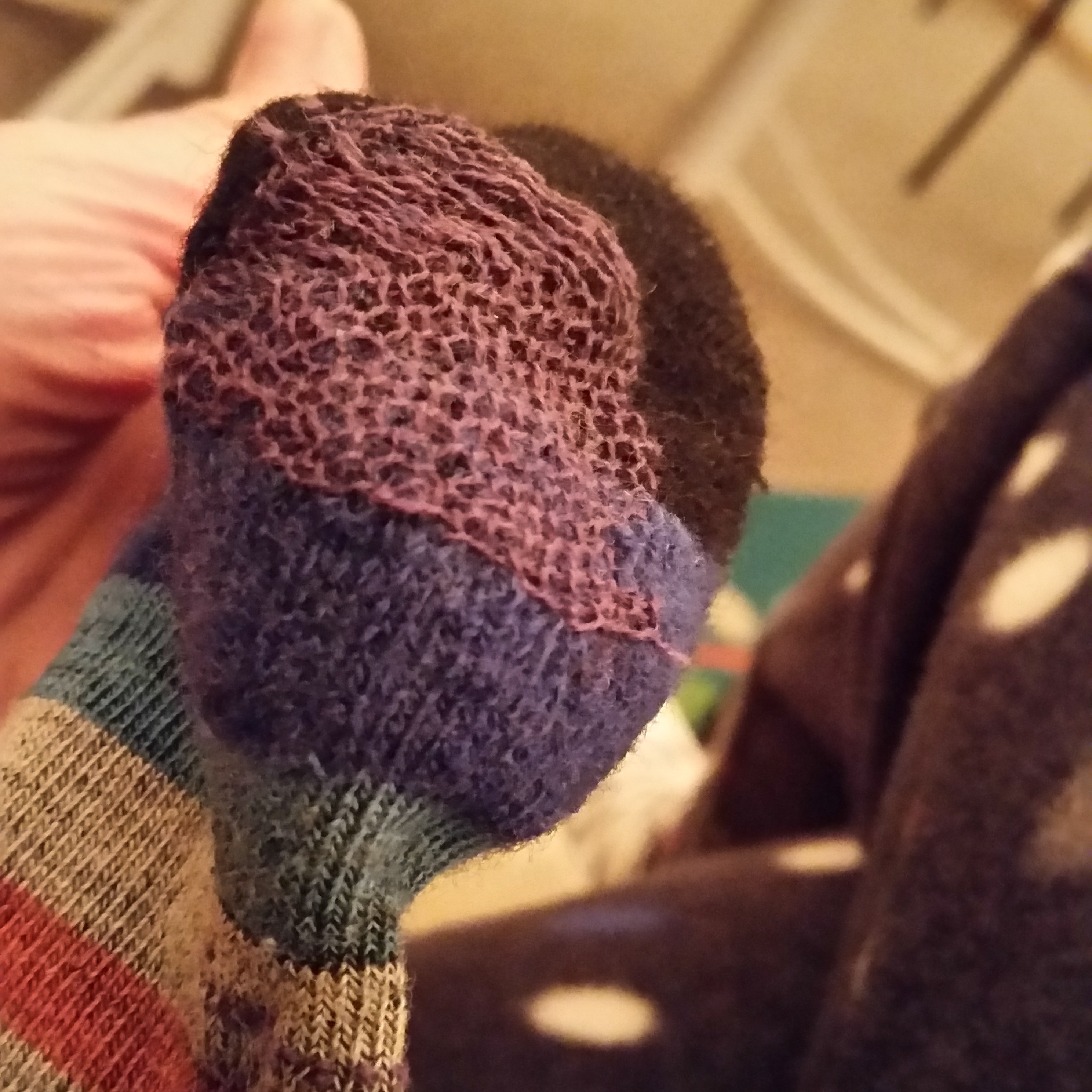 These socks are my other rescue mission. They’re SmartWool socks that I wear all the time, and have already lasted three times longer than all my other socks. Before I got these socks, I didn’t know that wearing socks could be a joy! I love how warm the wool is, and the festive striping makes me smile. There was a time when I would have laughed if anyone had predicted that I would be using my time and sewing skills to repair socks–how unglamorous! But my attachment to their prolonged existence is twofold: They were all gifts, and…do you know how expensive these suckers are?! It seemed a betrayal on all fronts to just scrap them or turn them into rags. This is still a work-in-progress (WIP), so I’ll post more pics later.