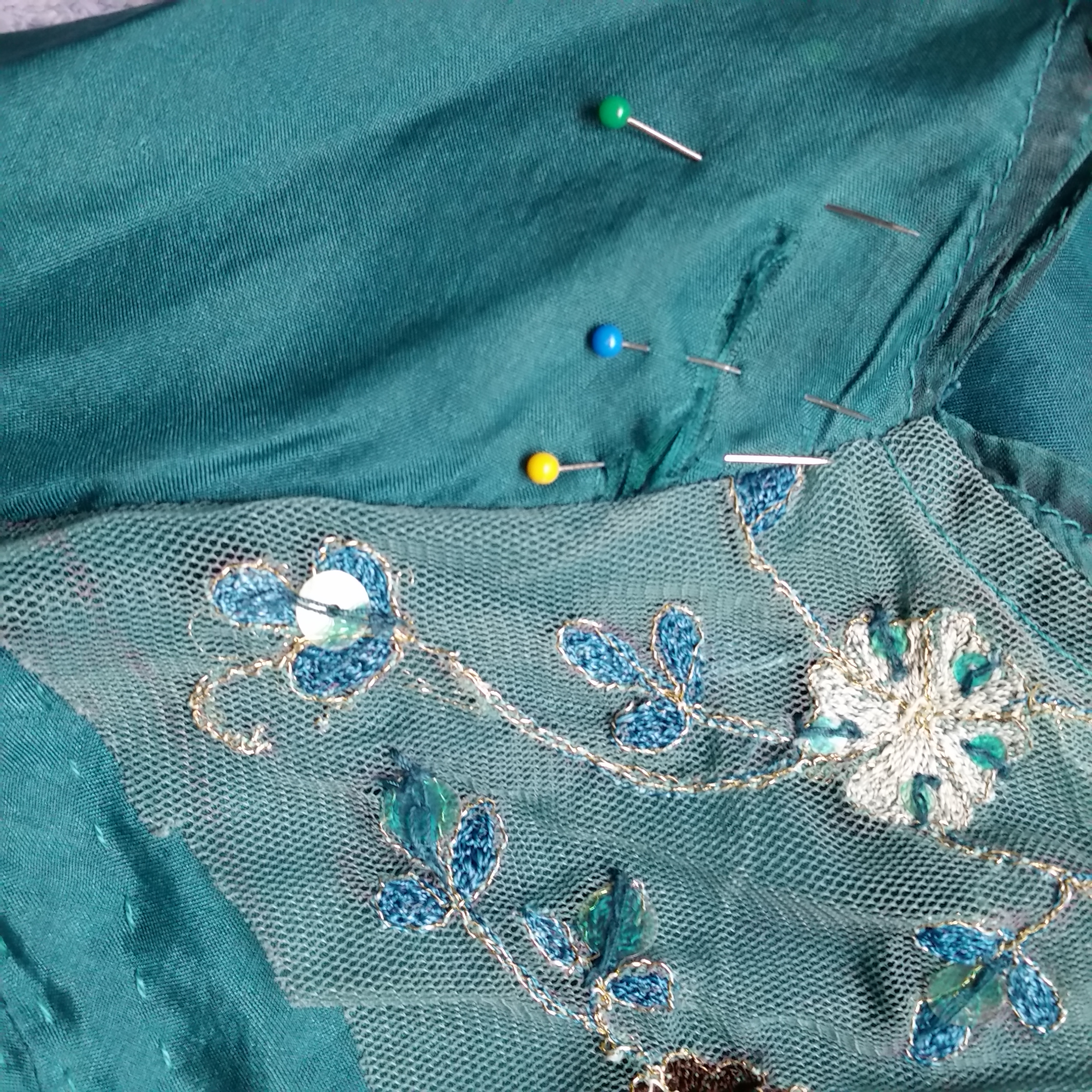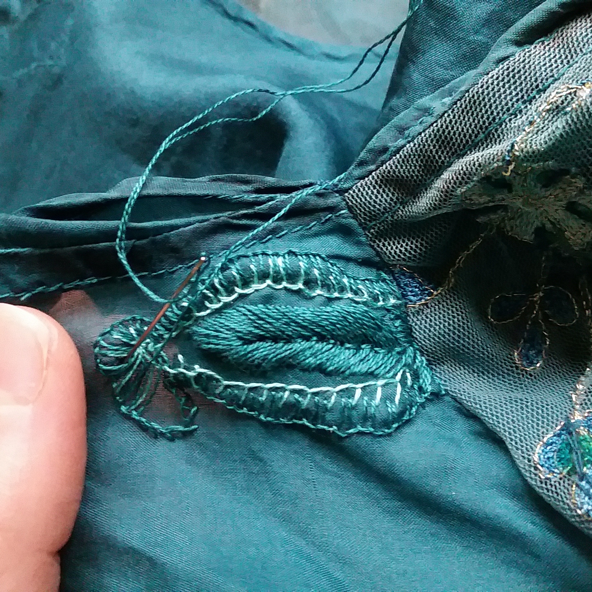 I used DMC floss in a very similar color as the silk. I thought about doing a more dramatic color, but considering the location of the repair-ahem-I figured I don’t need any more attention there, just a subtle texture. Plus, it intersects with the net overlay. The stitch is a variation on the Cretan Stitch, and had to keep adjusting to get the angle more leaf/feather-like, and filled in the gaps at the end.