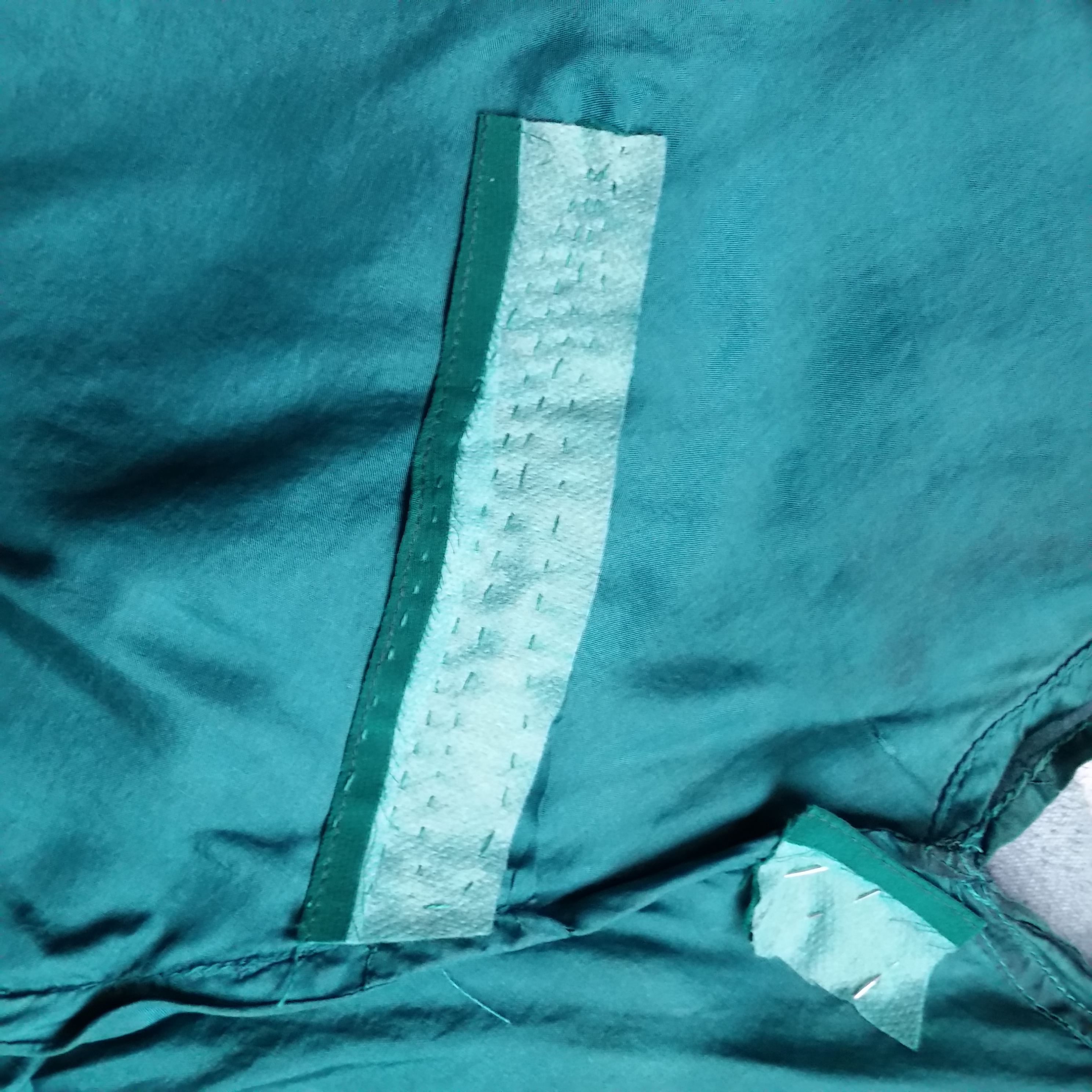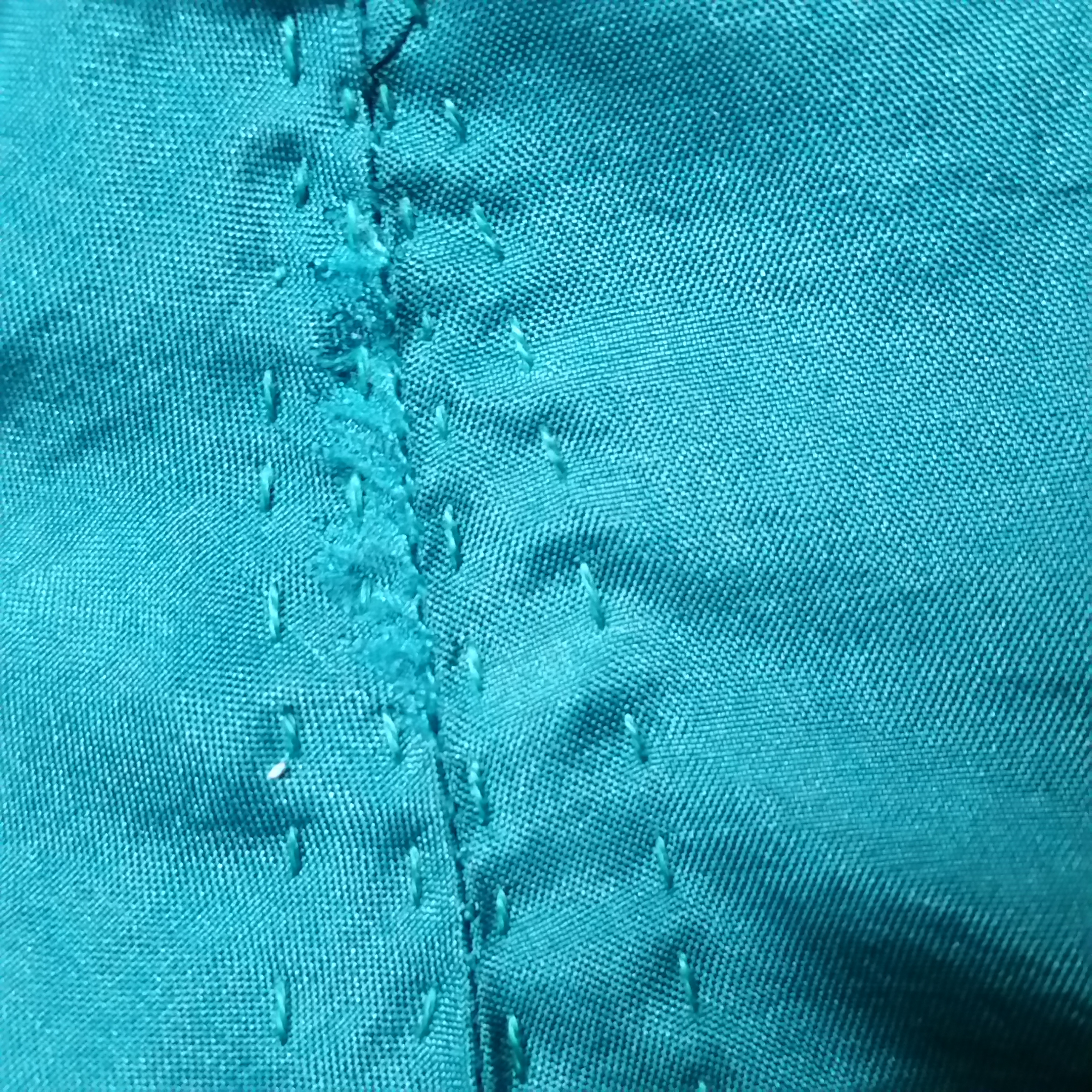It’s wearing through at point of pressure, obviously, so here we see the dart pulling, and on the back behind my arm. I found a similarly-colored silk dress at a thrift store, so I used part of the interfaced collar facing to lay behind the weak spots–I hope it doesn’t prove to be too heavy for the light silk.