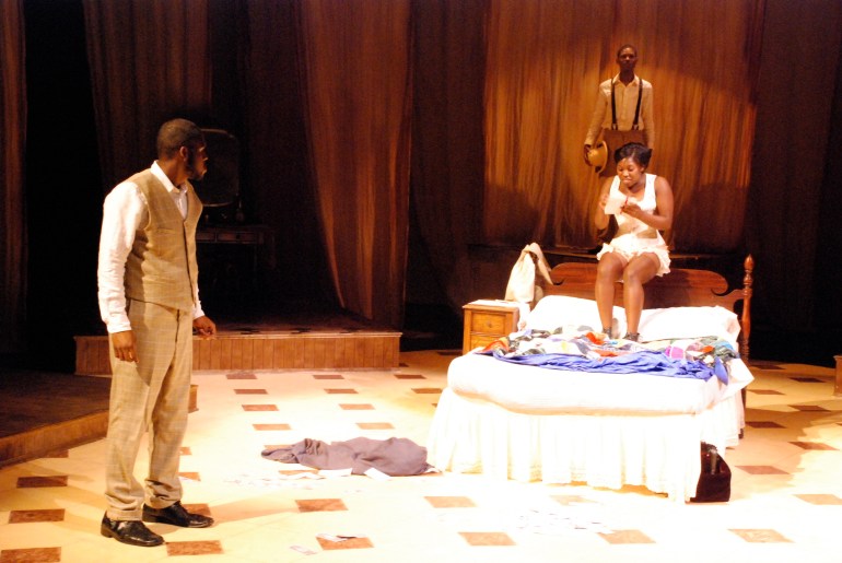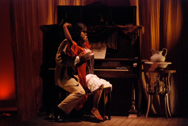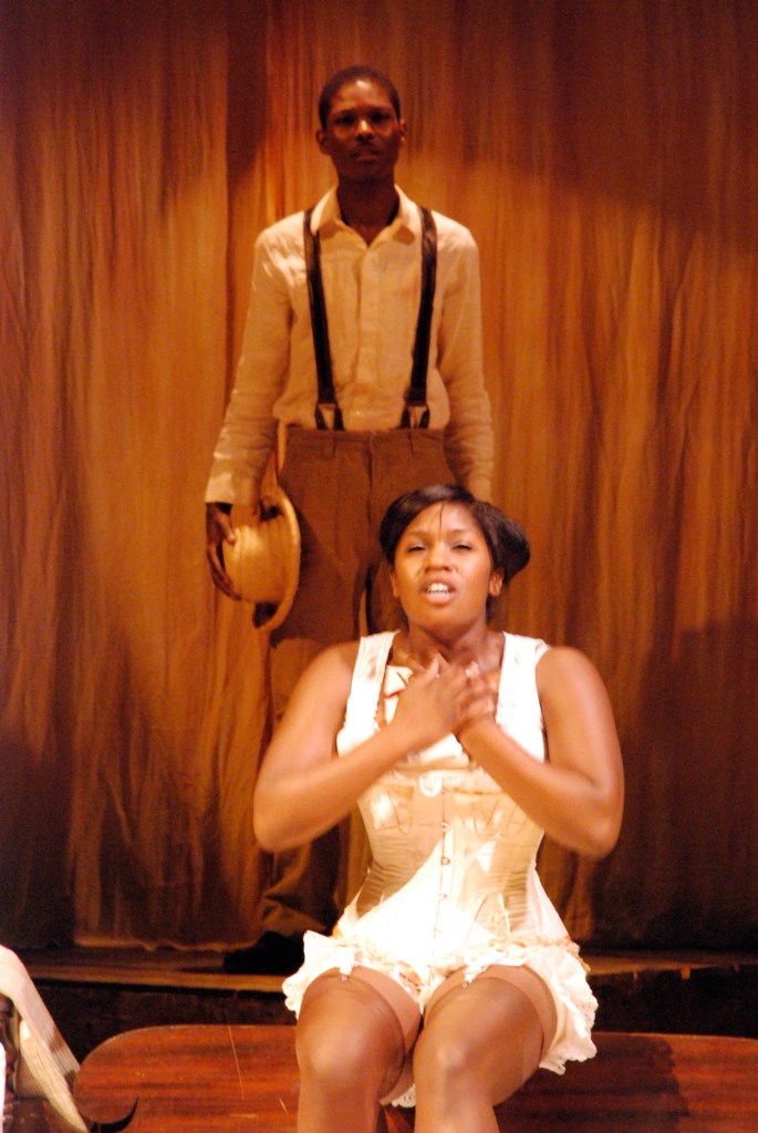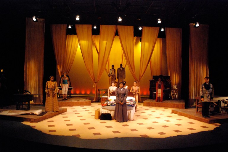 The playwright, Lynn Nottage, frames moments in the play as tableaus with headings underneath, such as: “Unidentified Negro Couple, Ca. 1900”. To evoke the feeling of lost memories the set was created out of warm, saturated neutral tones—like an antique sepia-tone photograph—with the costumes bringing these “photographs” to life with their color.