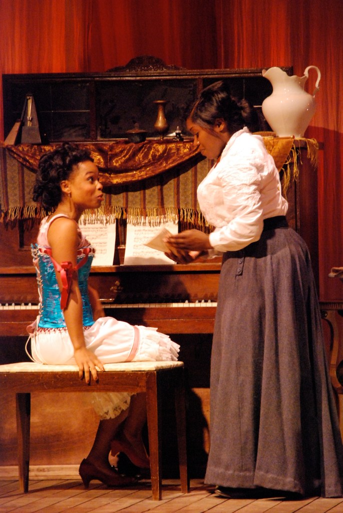 The central motif for Intimate Apparel was seamstress Esther’s crazy-quilt, which would have been made out of the elegant scraps of her lingerie work. While Esther herself dresses humbly, we see the vibrancy of her spirit reflected in her beautiful creations dressing the other characters around her.